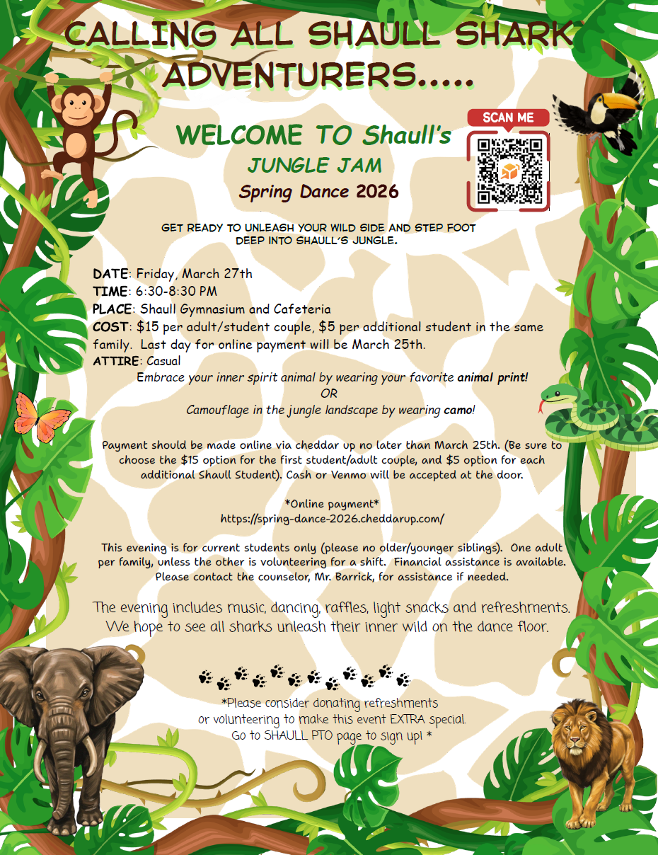March 25 - Spring Picture Day March 27 - Shaull Spring Dance - "Welcome to the Jungle!" NEW DATE April 2 - No School April 3 - No School April 6 - No School: Teacher In-service April 23 - Book Fair, Art Show, Multicultural Night at Shaull April 28 - Kindergarten Field Day (Rain Date May 6) May 7 - Grades 1-5 Field Day (Rain Date May 14) May 8 - 4th Grade Meet the Instruments Day at CVHS