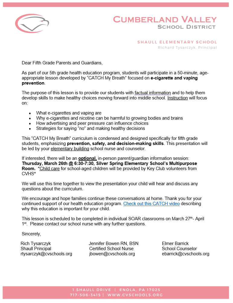 In order for our PTO to be successful for current and future generations of Shaull students and teachers, we need participation by our parents. Please reach out to me or the PTO at shpto@cvschools.org, or rtysarczyk@cvschools.org for information on how to attend a Zoom PTO meeting or how to get involved in our events. Our PTO meetings are the second Wednesday of each month and generally are 30-45 minutes in length.